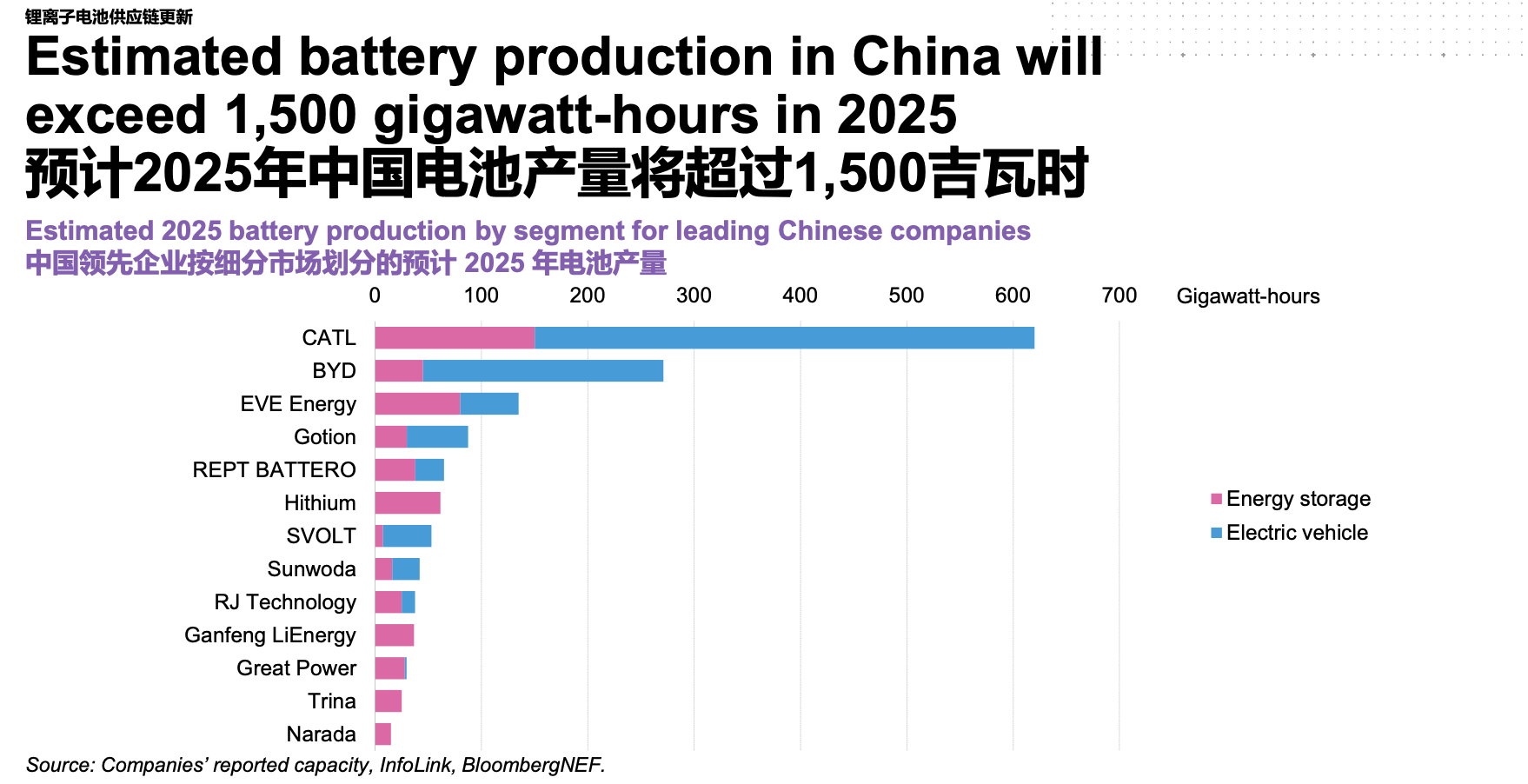 “中國(guó)儲(chǔ)能電池在生產(chǎn)端正快速擴(kuò)張,預(yù)計(jì)今年產(chǎn)量大于550 GWh,動(dòng)力電池產(chǎn)量則接近1000 GWh。”
